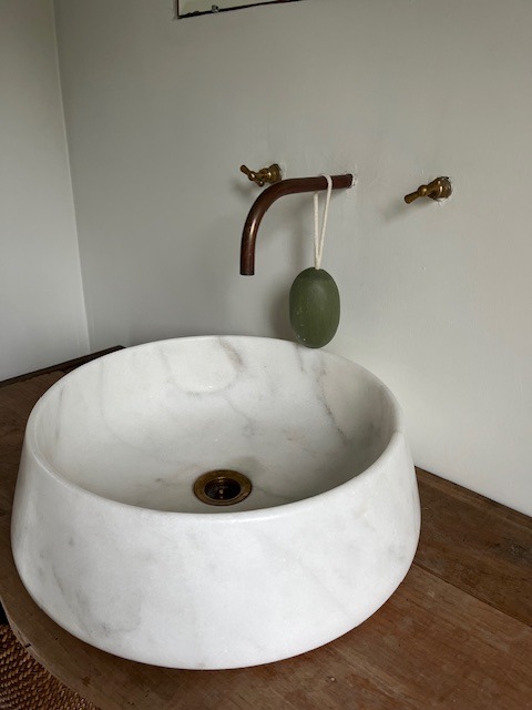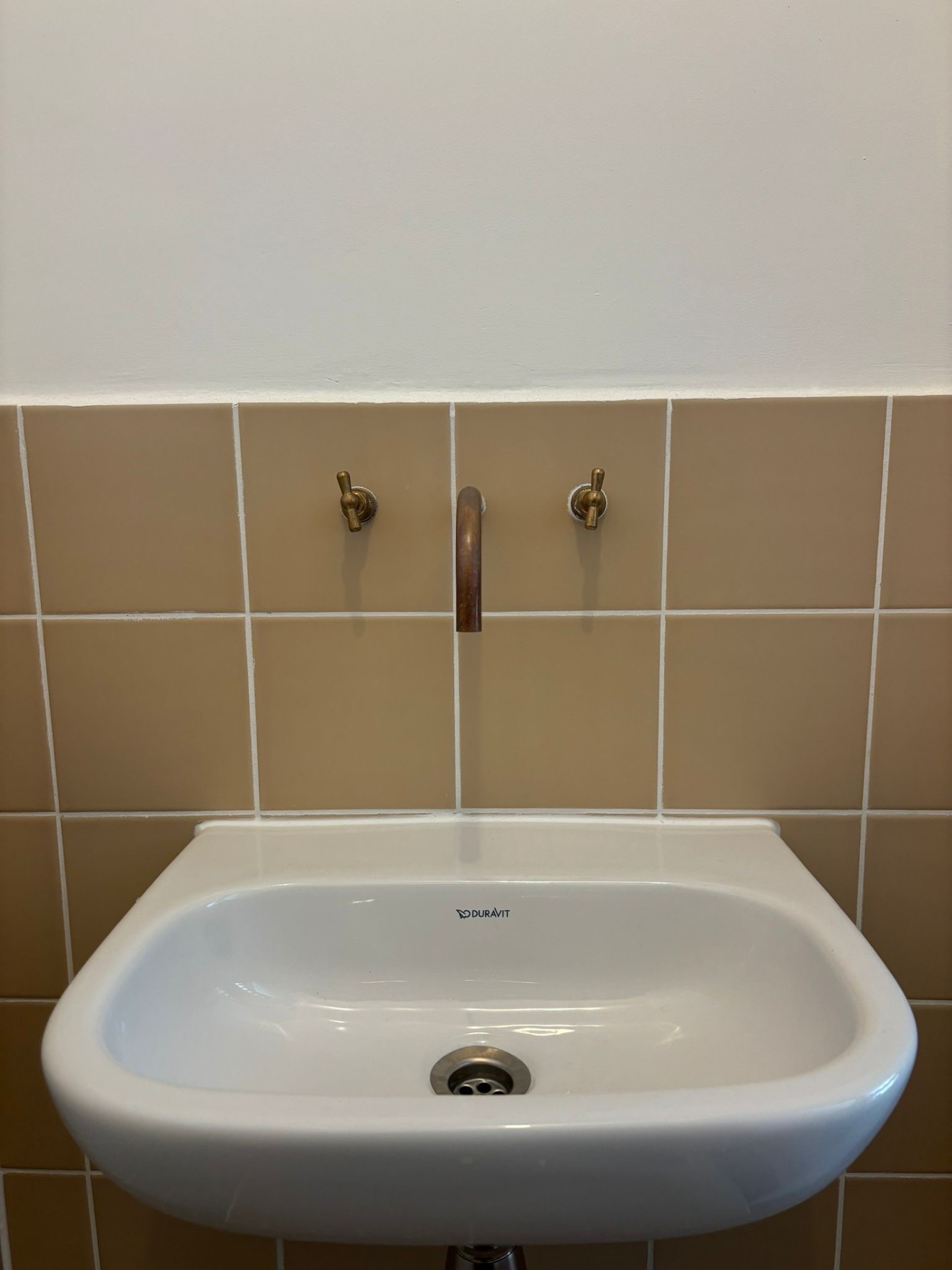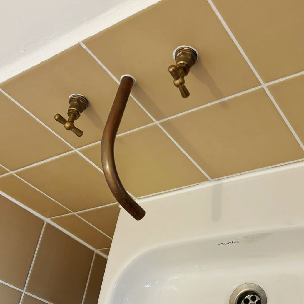 Deze wordt in de muur verwerkt, zodat men enkel de 2 draaiknoppen en de hals uit de muur ziet komen. Ideaal om te combineren met een arduinen wasbak. Deze kraan kan natuurlijk ook op de muur bevestigd worden. Iedere kraan wordt op maat gemaakt.